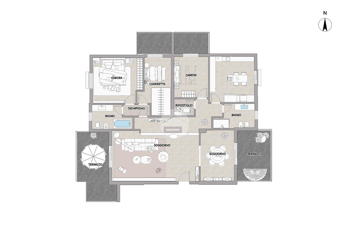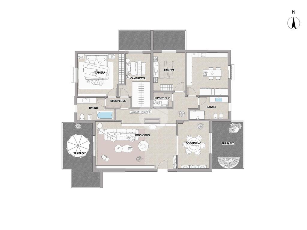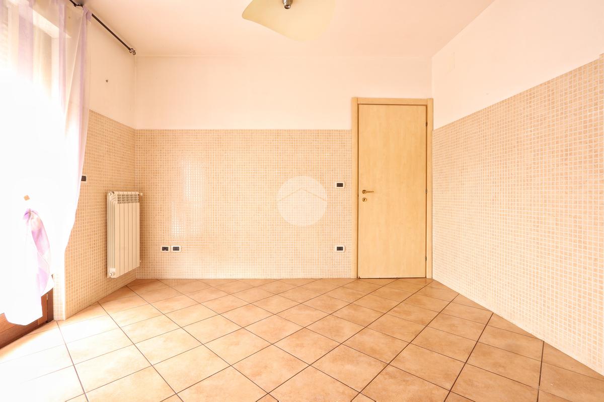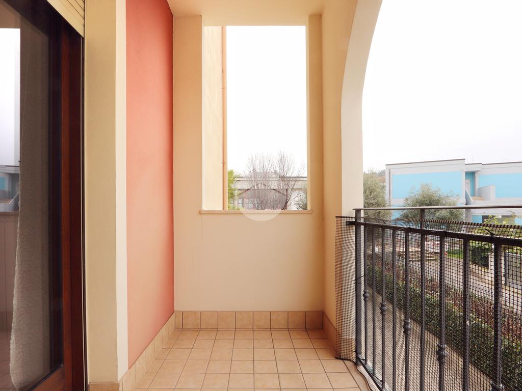 L'appartamento apre su un salone doppio, luminoso e arioso con due terrazini loggiati, uno dei quali con angolo lavanderia esterna, mentre la cucina, abitabile, dispone di un gradevole balcone alla francese.