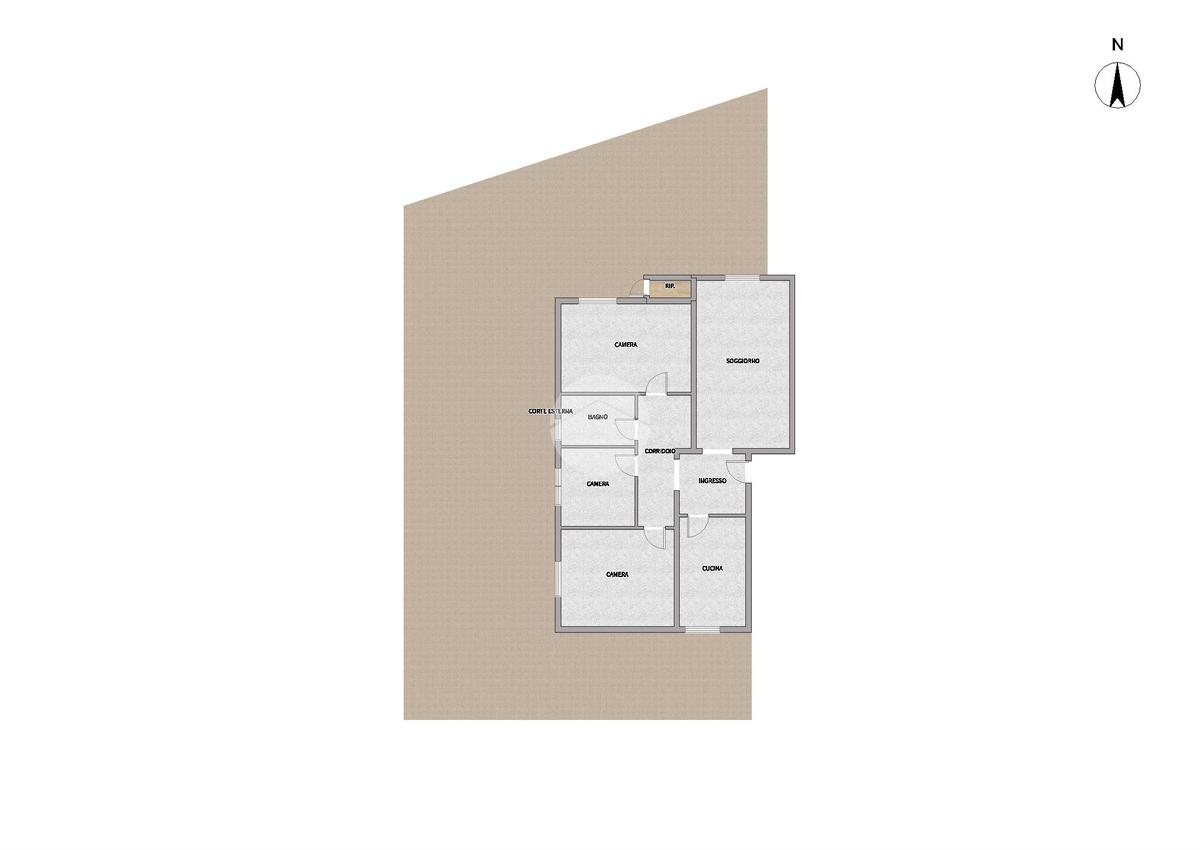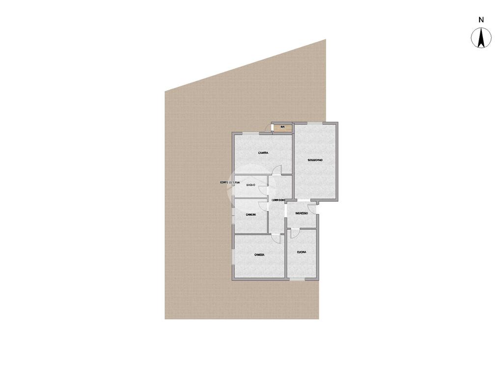 La soluzione, posta al piano terra di una piccola palazzina, apre su un ampio ingresso, soggiorno e cucina separata. Un corridoio conduce alla zona notte, con due ampie camere matrimoniali, camera singola con uscita sullo sfogo esterno e bagno con vasca.