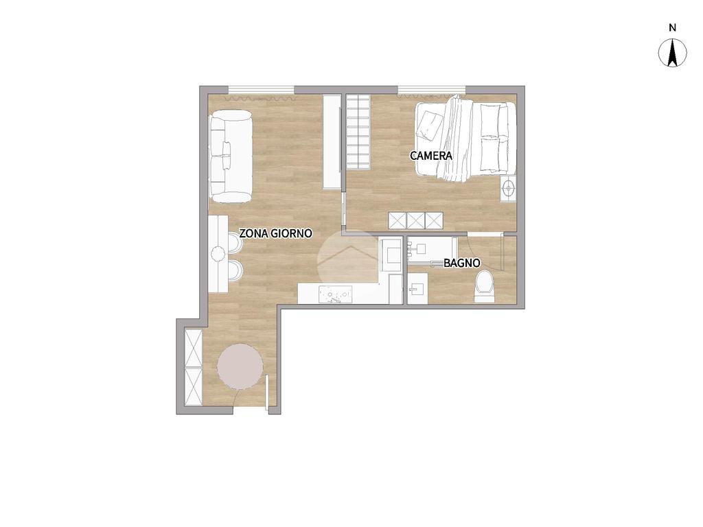 L'immobile apre su un grazioso soggiorno con angolo cottura, camera matrimoniale e bagno con vasca.